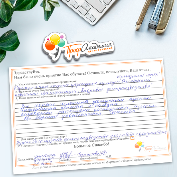 Обучение кадровому делопроизводству прошло успешно, "Профакадемия" предоставила быстрый срок обучения, персонал доброжелательный и вежливый, по всем вопросам отвечали быстро и понятно. Буду рекомендовать Вас своим близким.