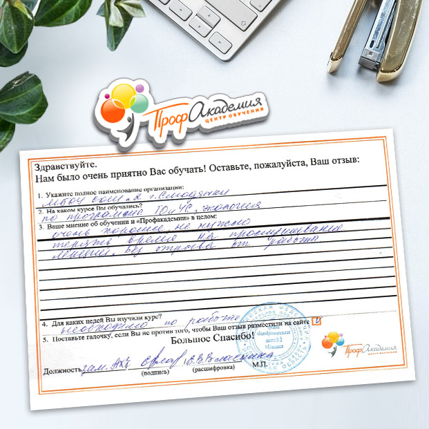Огромное спасибо, всей команде “Профакадемии”, очень слаженная работа, быстро удобно, познавательно, есть время сделать заметки и разобраться в вопросах, узнать больше! Работаем уже несколько лет с Вами и очень довольны!!! Относитесь внимательно к любому клиенту, даже если обучается один человек, очень приятно! Спасибо всем! Процветания и стабильности