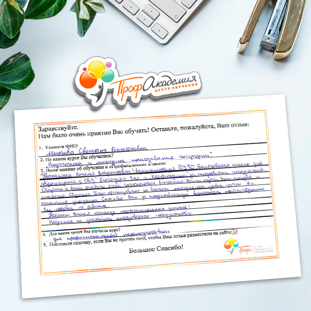Уважаемая Наталья Владимировна! Администрация ГОУТО "Болоховская школа для обучающихся с ОВЗ" благодарит вас и " Профакадемию" за плодотворное сотрудничество. Общение с вами оставило очень благоприятное впечатление. Ваши курсы учителя географии были полезны и интересны. Обучение было организовано на высоком методическом уровне. Учтены все пожелания заказчика. Спасибо вам за предоставленную возможность пройти обучение без отрыва от работы. Желаем вашей команде профессиональных успехов! Надеемся на дальнейшее плодотворное сотрудничество.