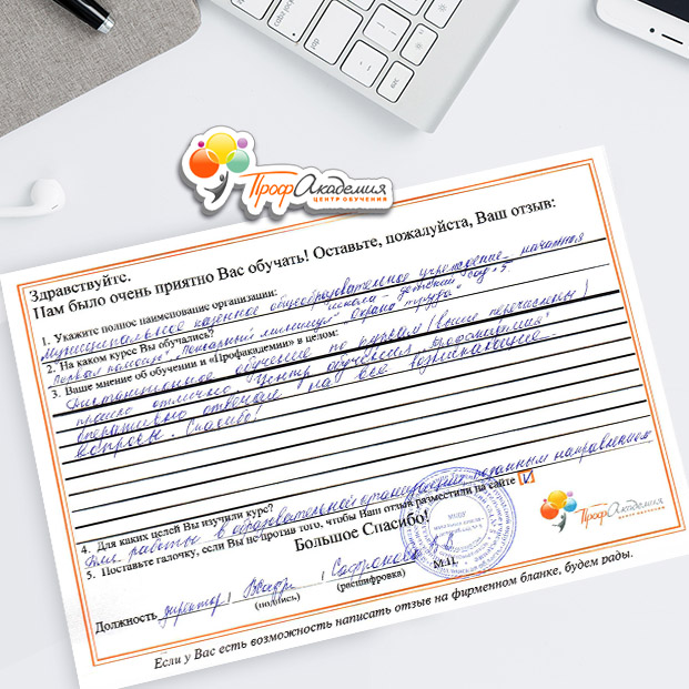У всех педагогов нашей школы только положительные впечатления от обучения в "Профакадемии" Учебный материал очень интересный. Есть и презентации, и видеоматериалы. Все воспринимается легко и доступно. Все подтемы разложены по полочка, очень удобно для изучения! Очень вам благодарны, планируем и дальнейшее обучения в вашей Академиии.