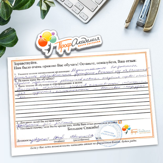 Хочется выразить огромную благодарность ООО "Профессиональная академия" за предоставления образовательной услуги. Особое спасибо специалисту по работе с клиентами Аликбаеву Николаю Ураловичу. Приятно было работать с хорошо знающим свое дело специалистом.