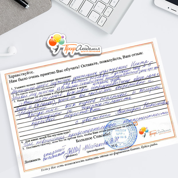 Система обучения (дистанционная форма) оценена работниками МБДОУ - 5 баллов! Благодарим ООО "Профессиональная Академия" за оказанные услуги, за оперативность, доступность, сотрудничество!